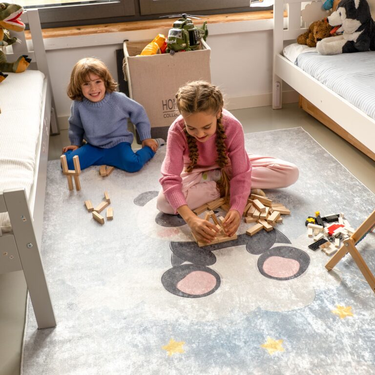 Emma Collection are printed rugs, the absence of the classic pile is something that makes them even more special. They are machine washable (at 30 degrees) and have a non-slip underside – just in case your child decides to make the rug their new playground. Despite the short pile, the rug is pleasant to the touch and insulates the cold very well. The decoration is very lightweight – this makes it easy to clean, as well as giving you the opportunity to create a play area almost anywhere in the house.