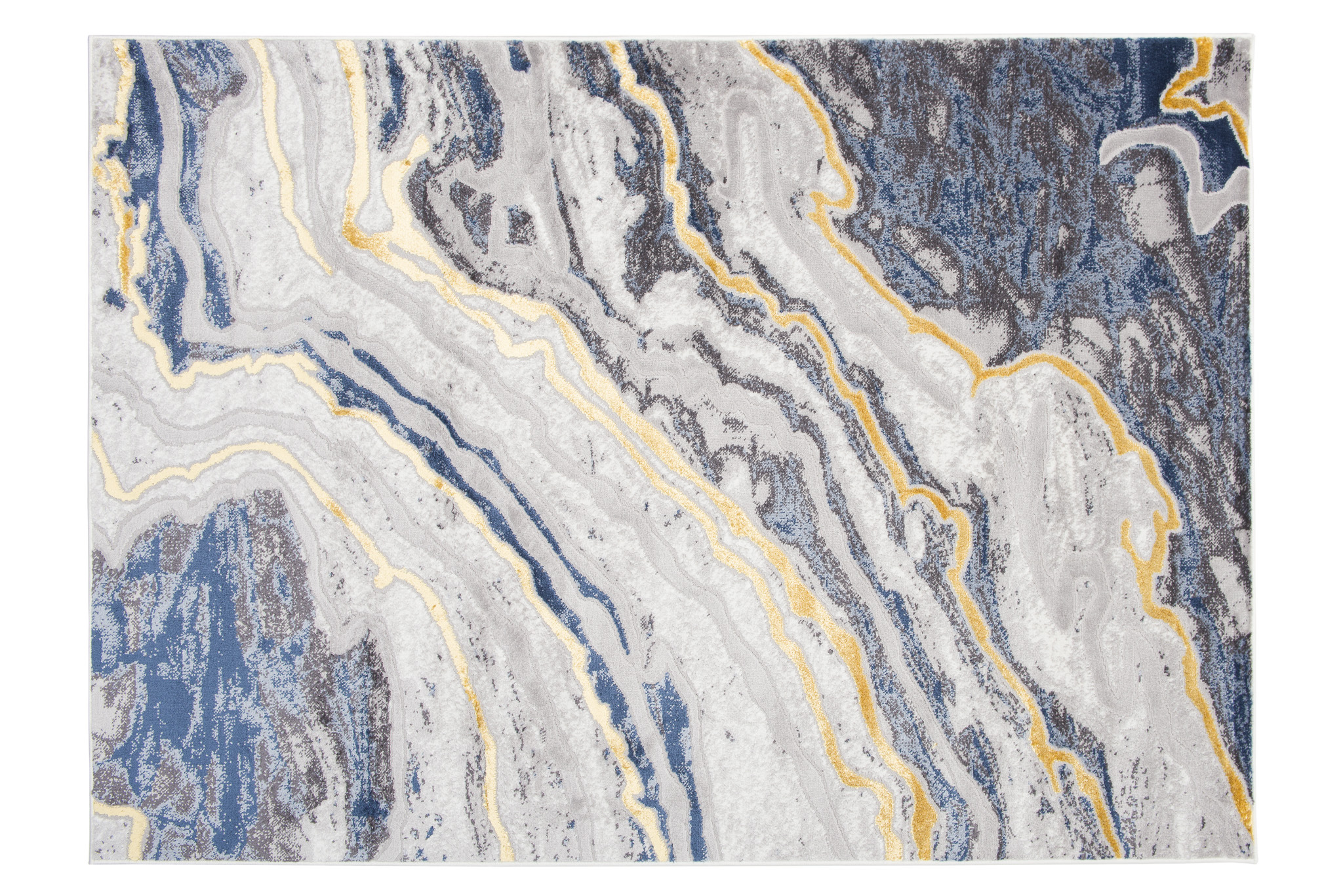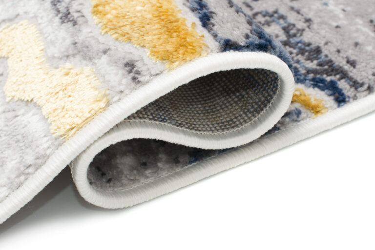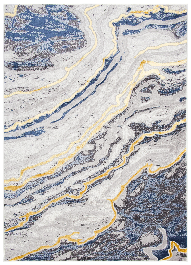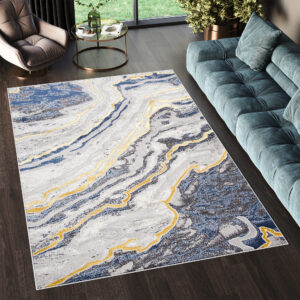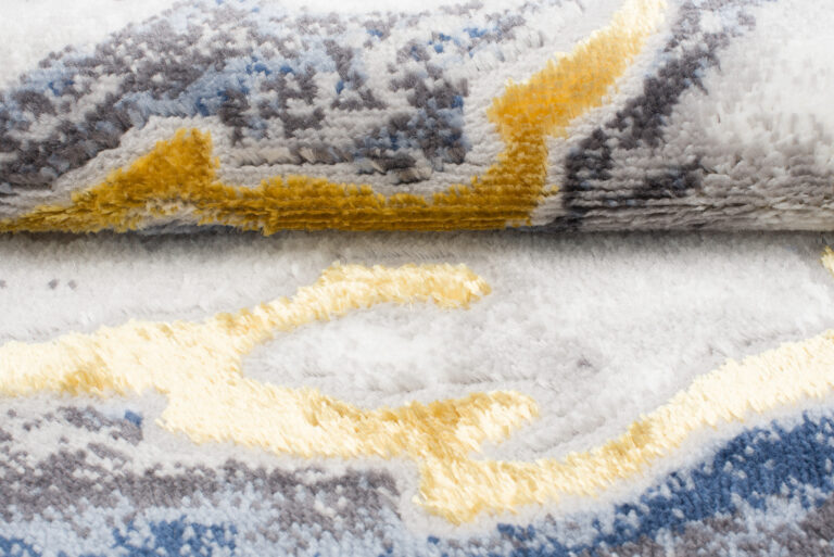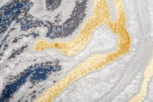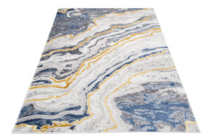 What makes this collection stand out from others are the abstract patterns and the subtle gold thread, which adds a unique shine to the rugs. The dominant colours of the collection are deep grey, elegant navy blue and luxurious gold, which blend harmoniously together to create an eye-catching visual effect.