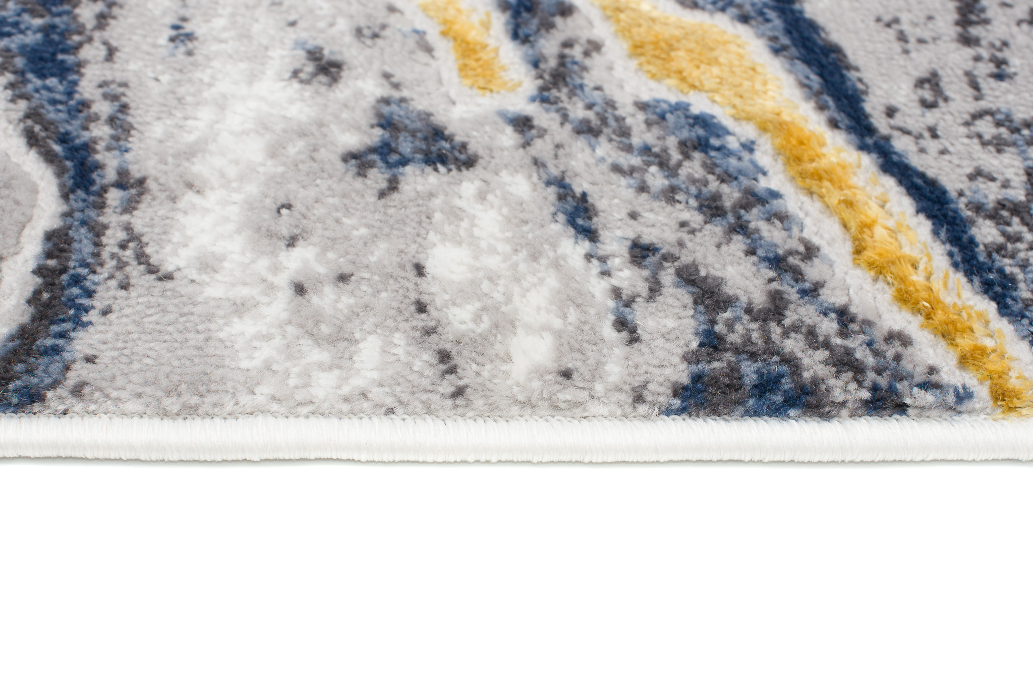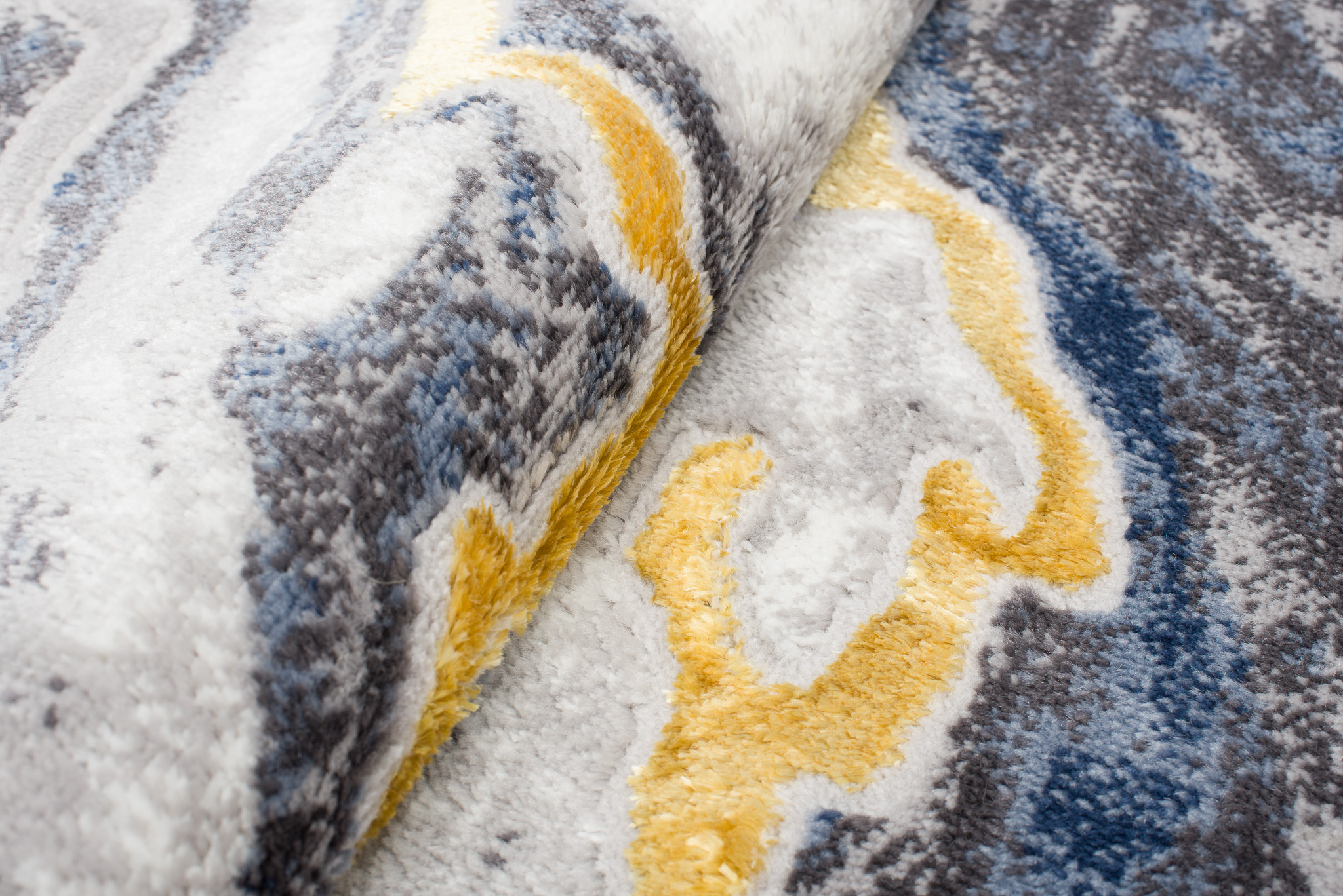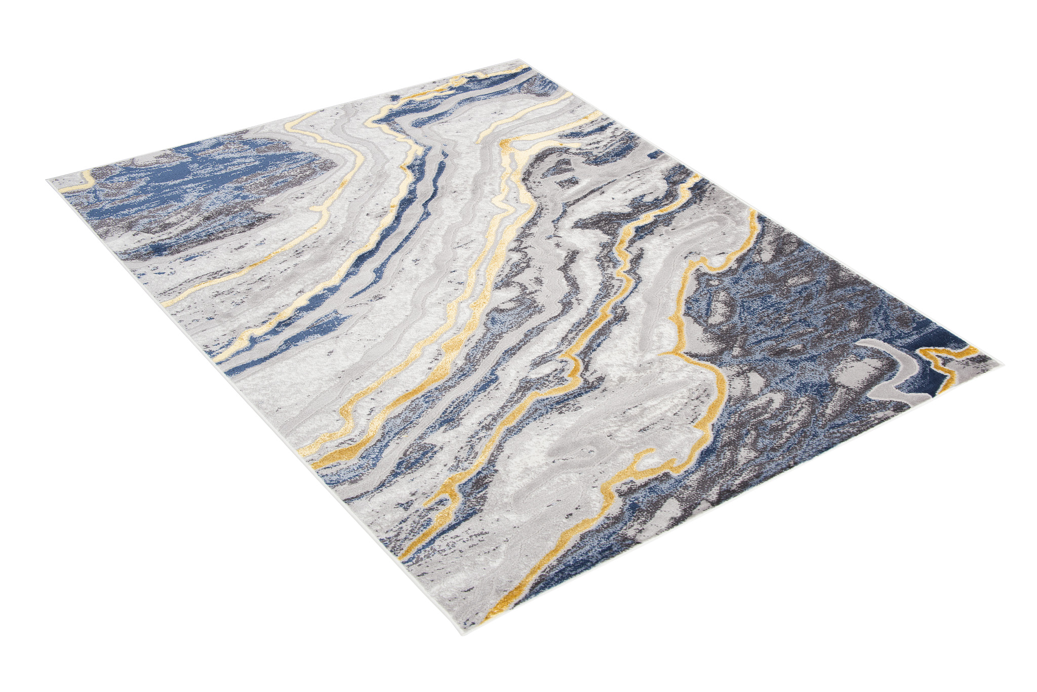 What makes this collection stand out from others are the abstract patterns and the subtle gold thread, which adds a unique shine to the rugs. The dominant colours of the collection are deep grey, elegant navy blue and luxurious gold, which blend harmoniously together to create an eye-catching visual effect.